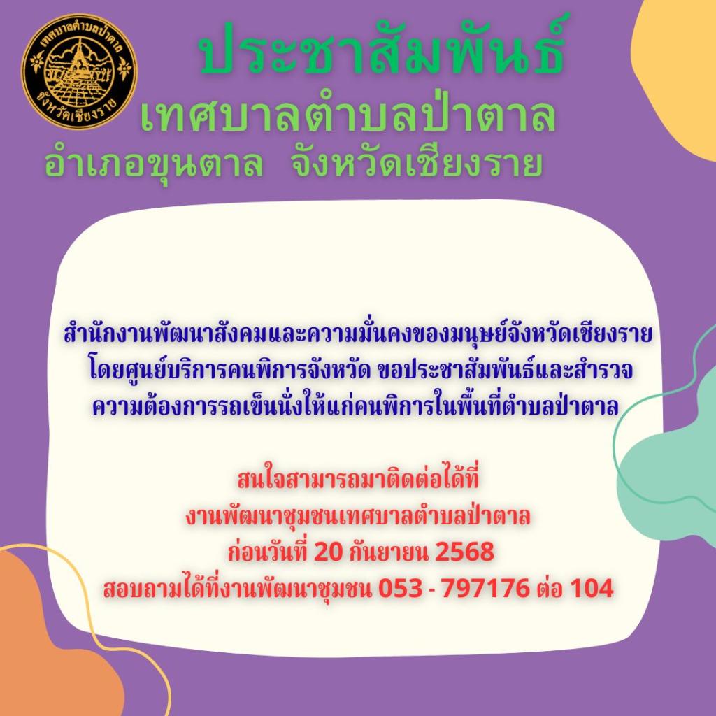 5 | (ประกาศรายชื่อผู้ชนะการเสนอราคา / ประกาศผู้ได้รับการคัดเลือก) ซื้อวัสดุก่อสร้าง เพื่อซ่อมแซมห้องน้ำสาธารณะทางขึ้นพระธาตุขุนตาล ลานค้าชุมชนศูนย์ OTOP ของเทศบาลตำบลป่าตาล จำนวน 25 รายการ โดยวิธีเฉพาะเจาะจง | คลิกอ่าน.. | 24/9/2568 |